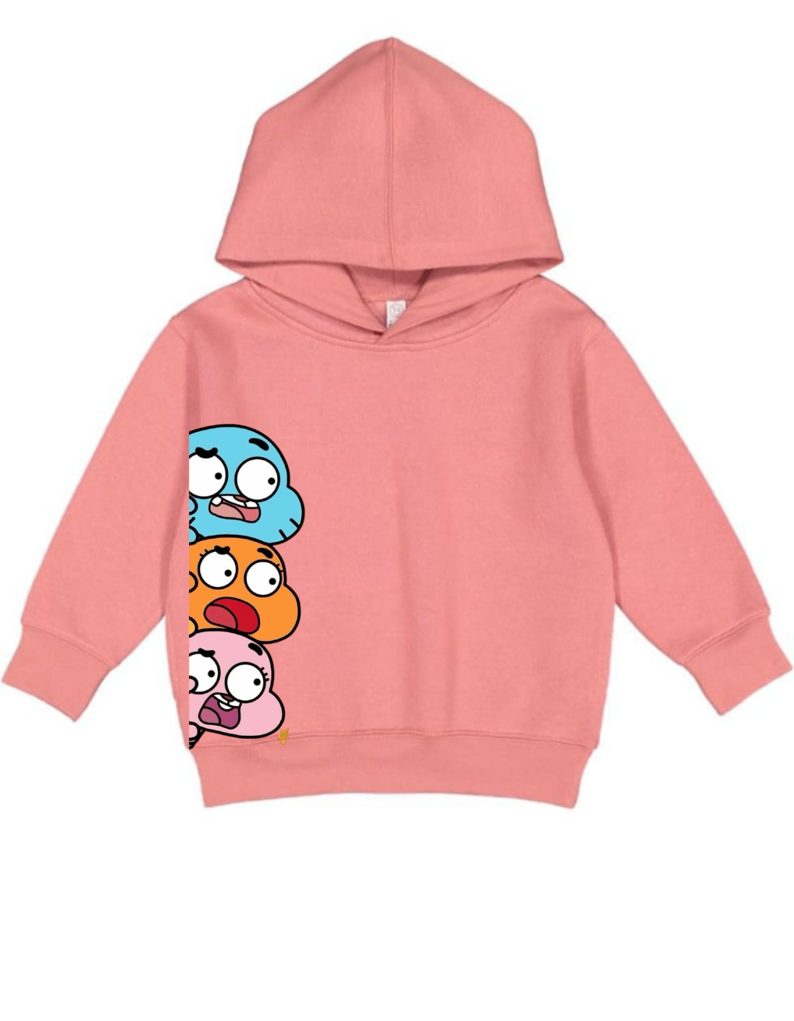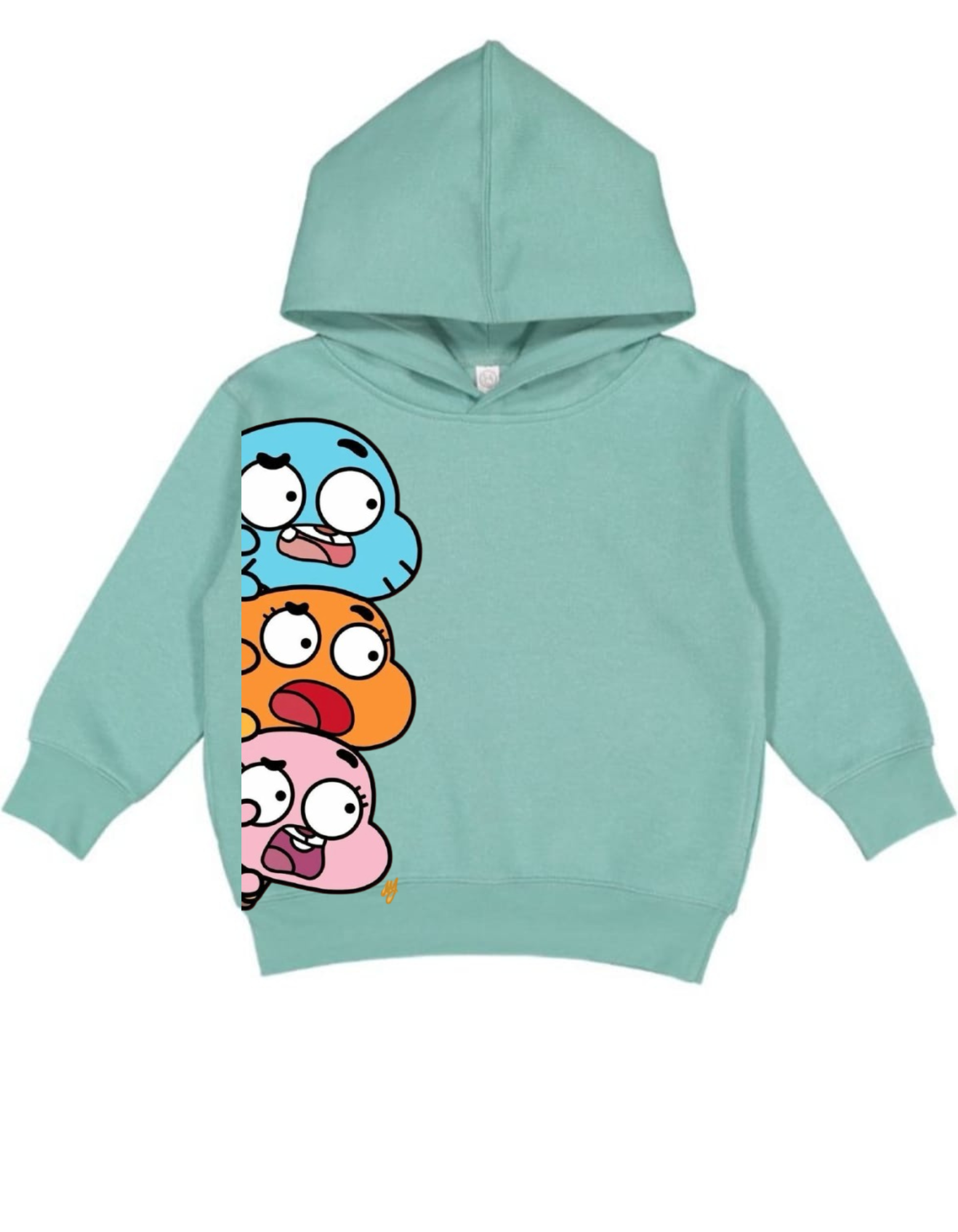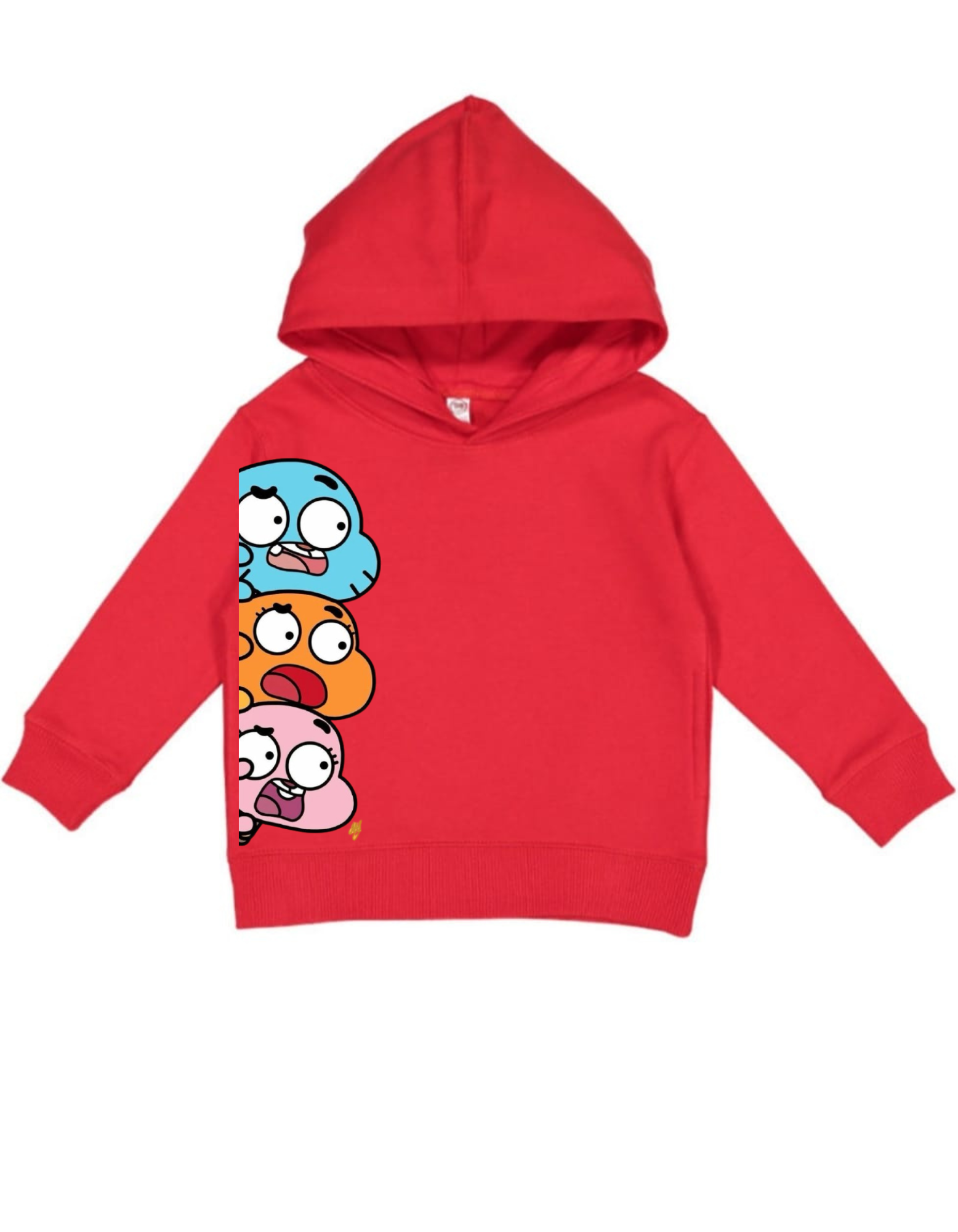 This cozy hoodie showcases a stacked graphic of the three main characters—Gumball, Darwin, and Anais—peeking out from the left side, each with a wildly shocked or surprised expression on their faces.