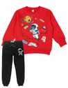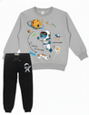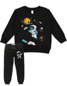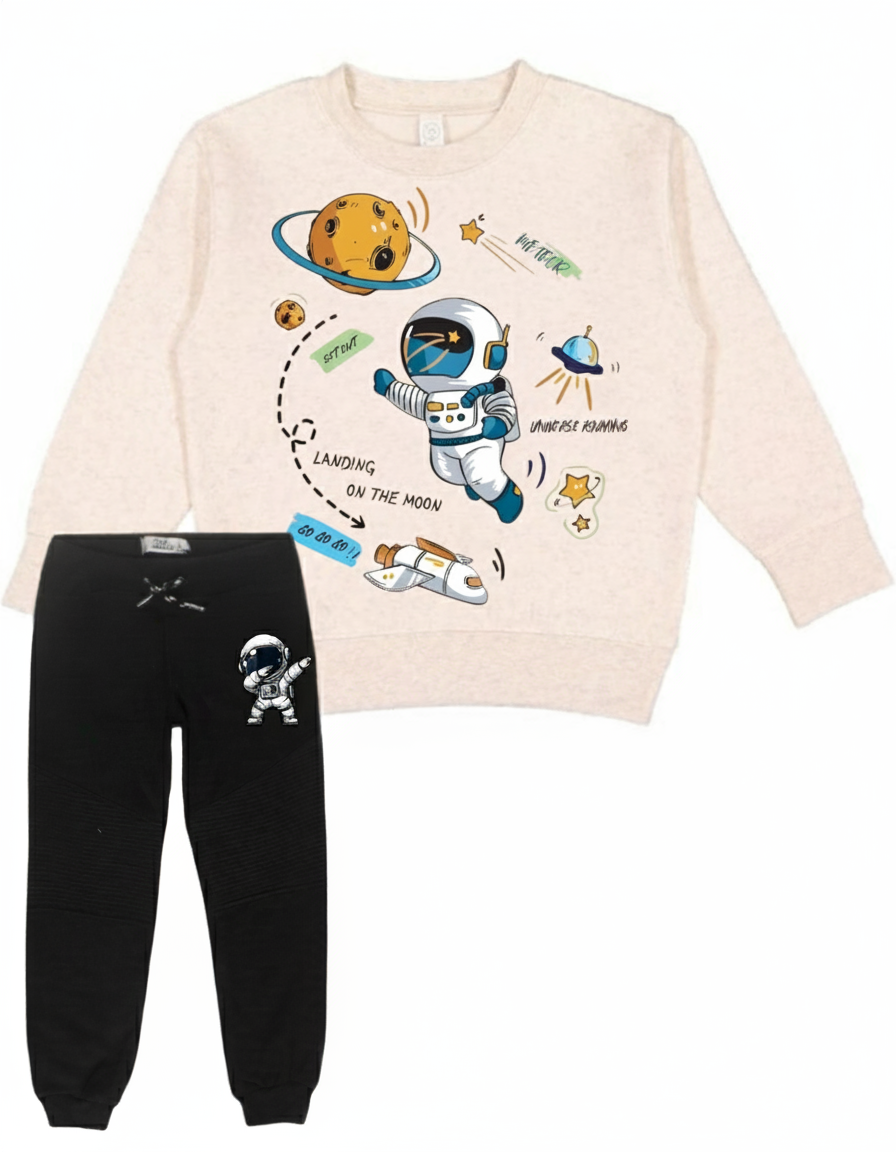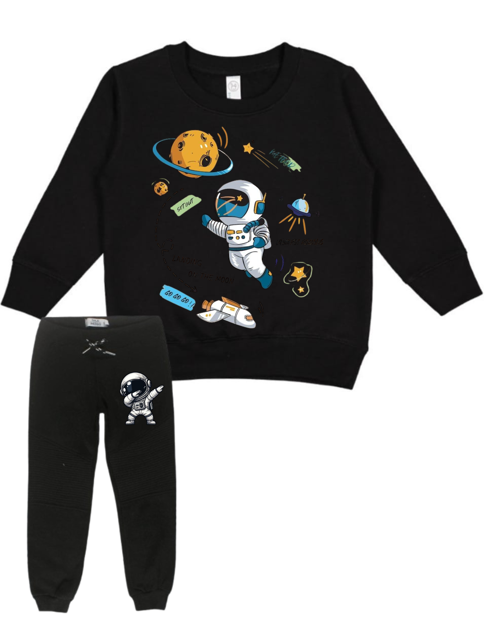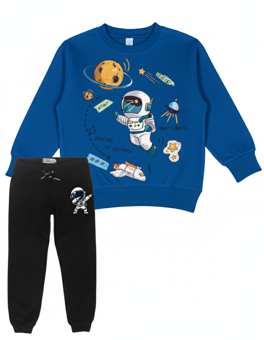 The Royal Blue sweatshirt features a vibrant, cartoon-style graphic of an astronaut floating in space, surrounded by planets, a UFO, and a shuttle, with fun phrases like "LANDING ON THE MOON." The coordinated Black joggers have a small, matching astronaut "dabbing" graphic on the leg and stylish quilted knee patches.