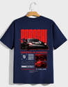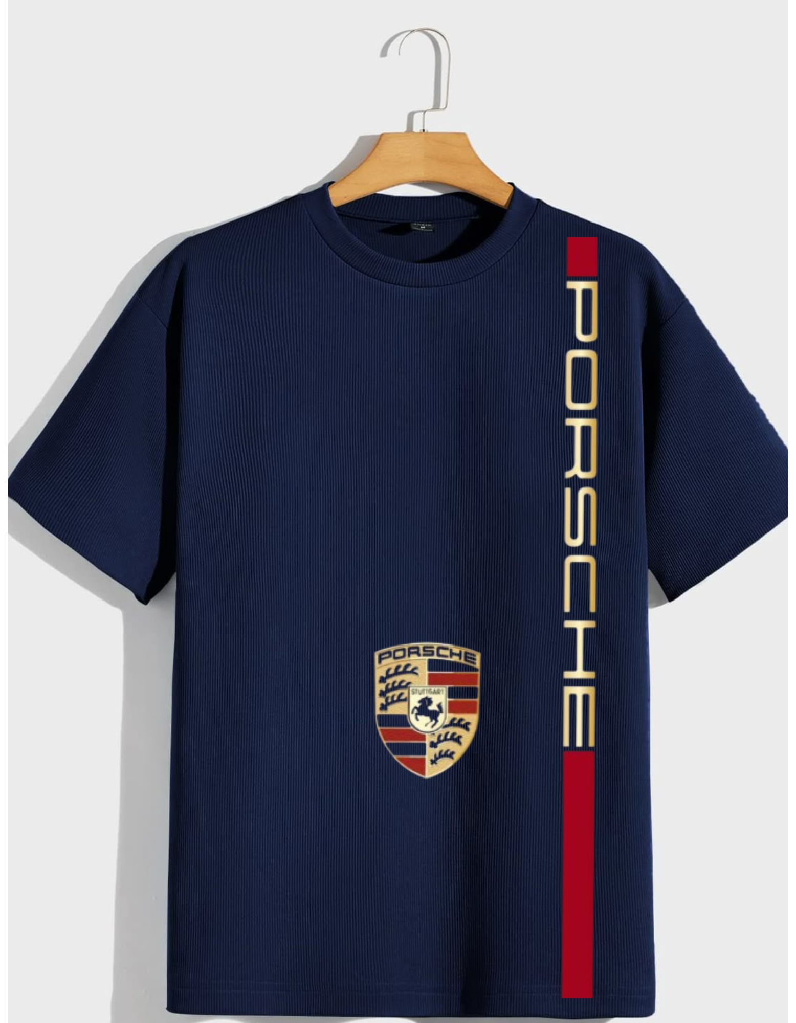 This shirt is crafted from a comfortable, ribbed fabric in a deep Navy Blue and features a modern, slightly oversized dropshoulder fit. The striking back graphic uses a bold Red and Black design centered around a powerful image of a Porsche 911 GT3 race car. The design incorporates large, geometric "PORSCHE" text, technical schematics, interior shots, and the motivational text "REVOLUTION" and "GRAND TOUR" for a detailed, high-performance aesthetic.