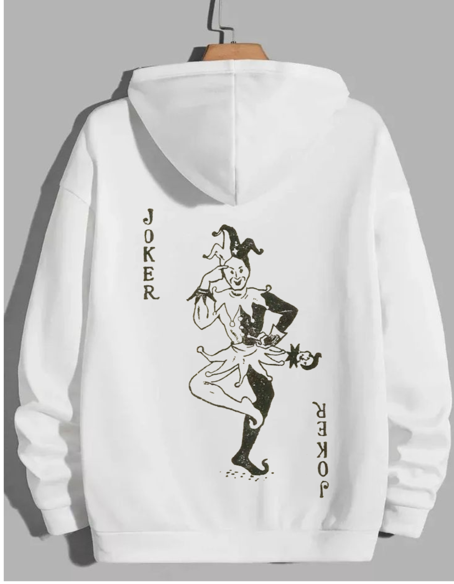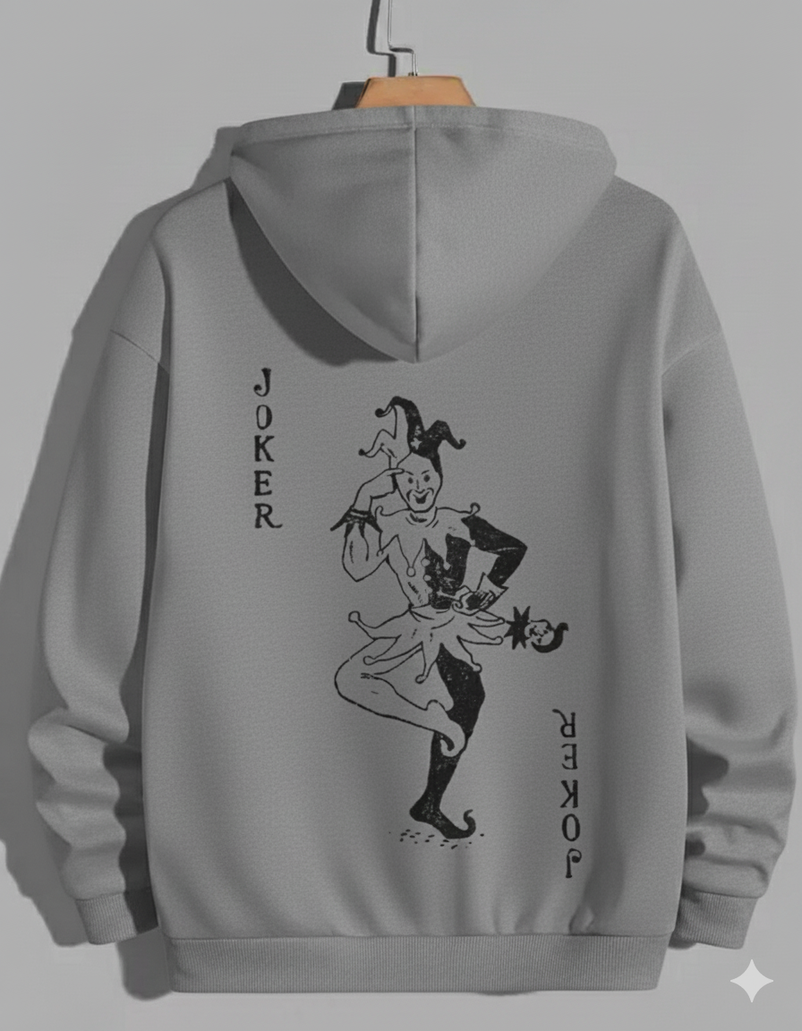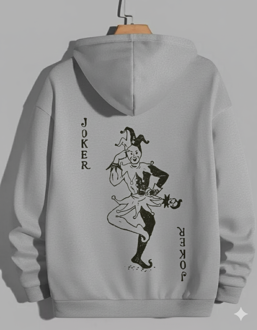 This is a pullover hoodie in a solid light grey or heather grey color. The design is a large graphic centered on the back, mimicking the look of a classic playing card.