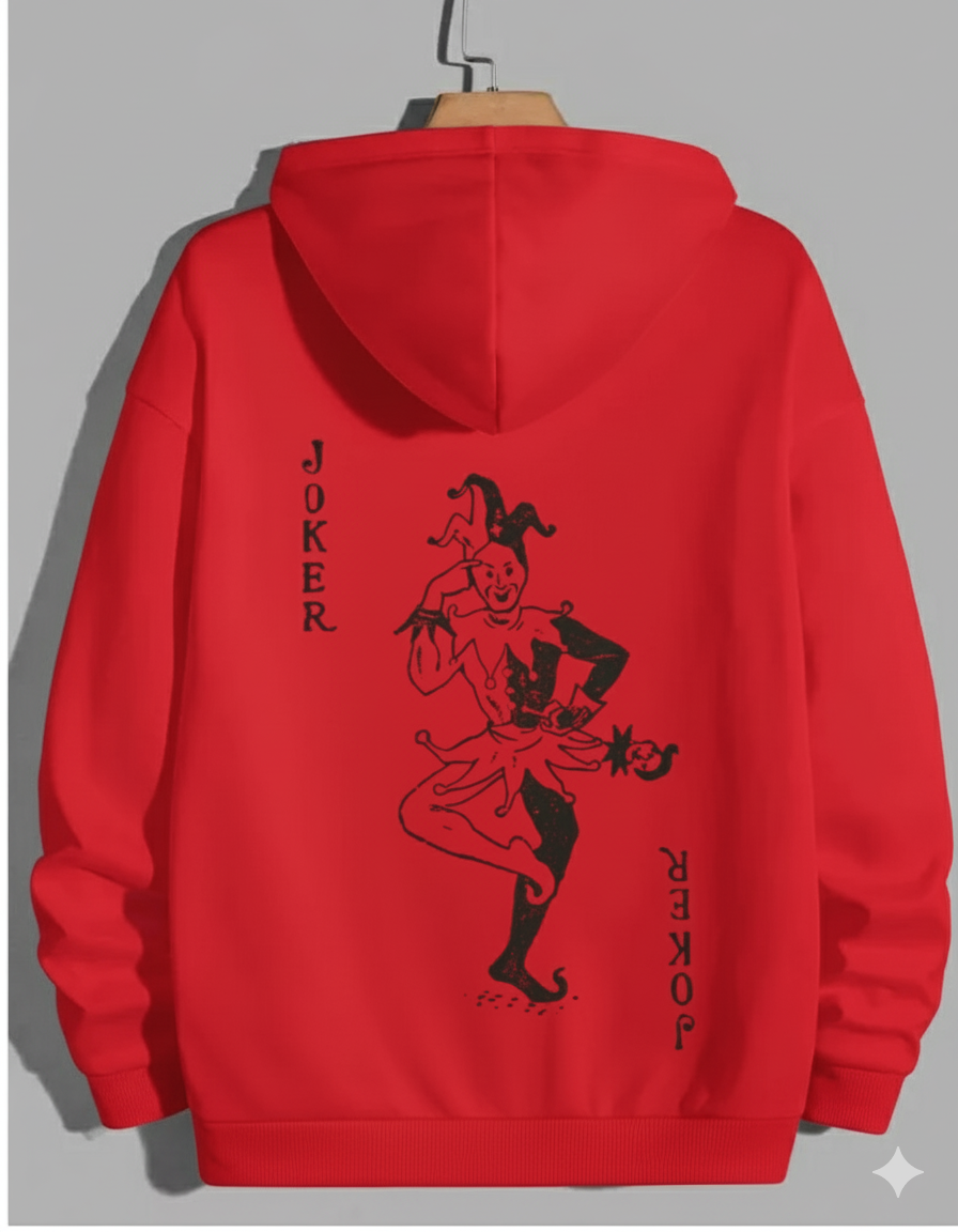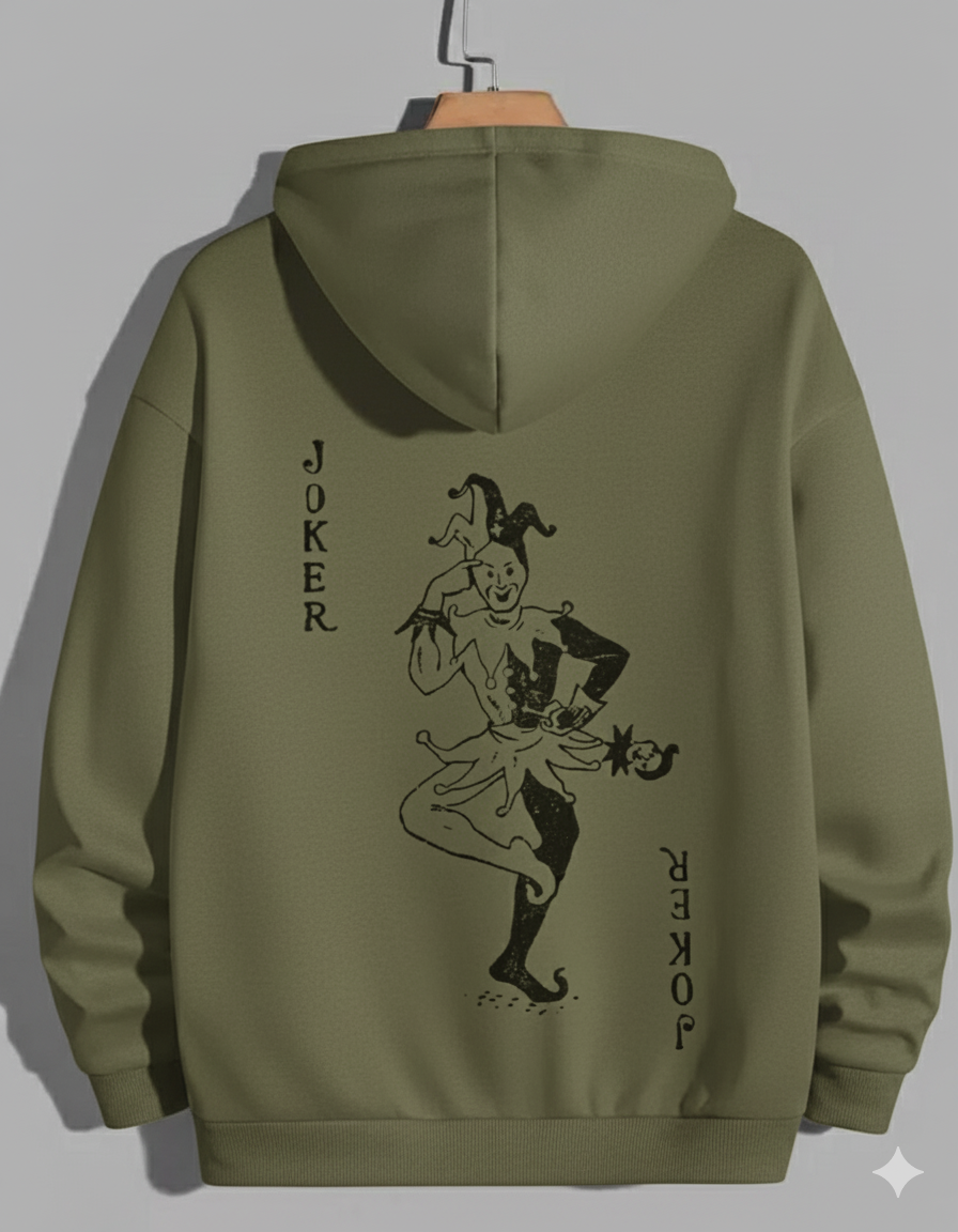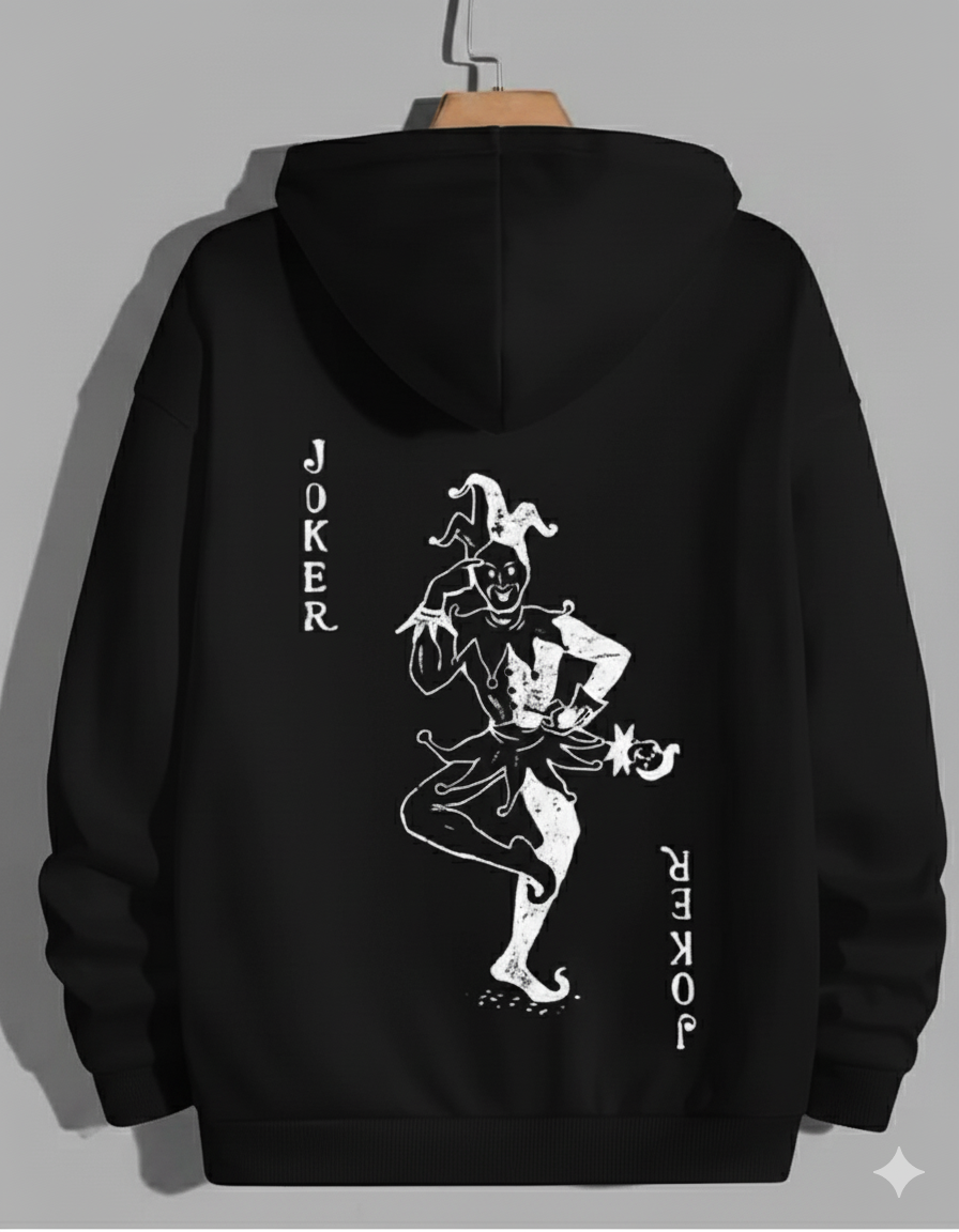 This is a pullover hoodie in a solid light grey or heather grey color. The design is a large graphic centered on the back, mimicking the look of a classic playing card.