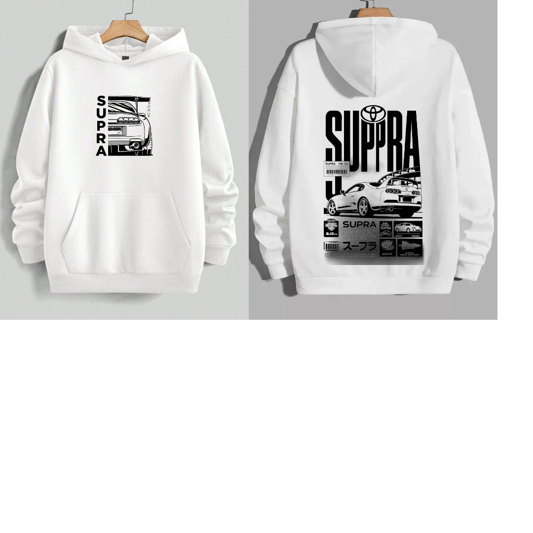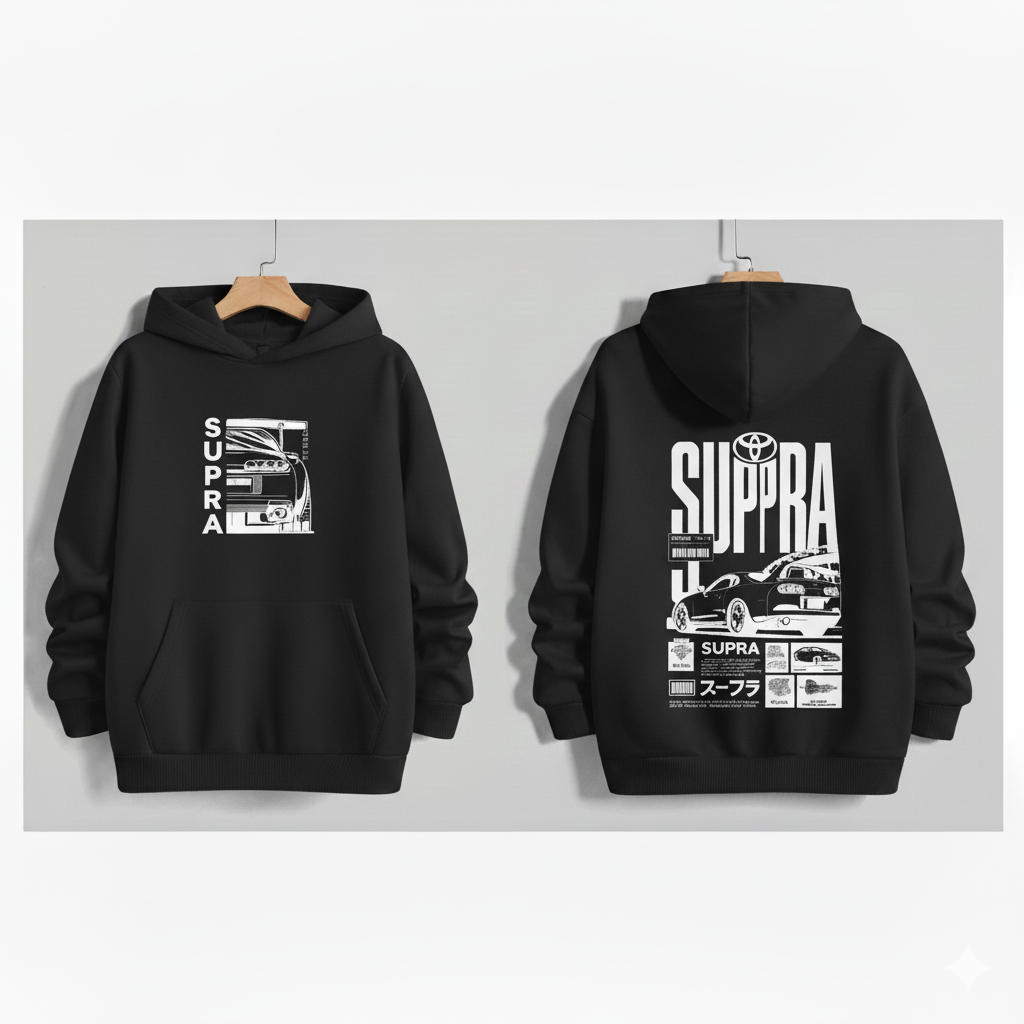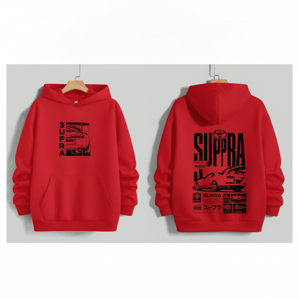 This is a bold, red pullover hoodie that celebrates the iconic Toyota Supra sports car. It features graphics on both the front and the back in high-contrast black print, appealing to car enthusiasts and fans of JDM (Japanese Domestic Market) culture.