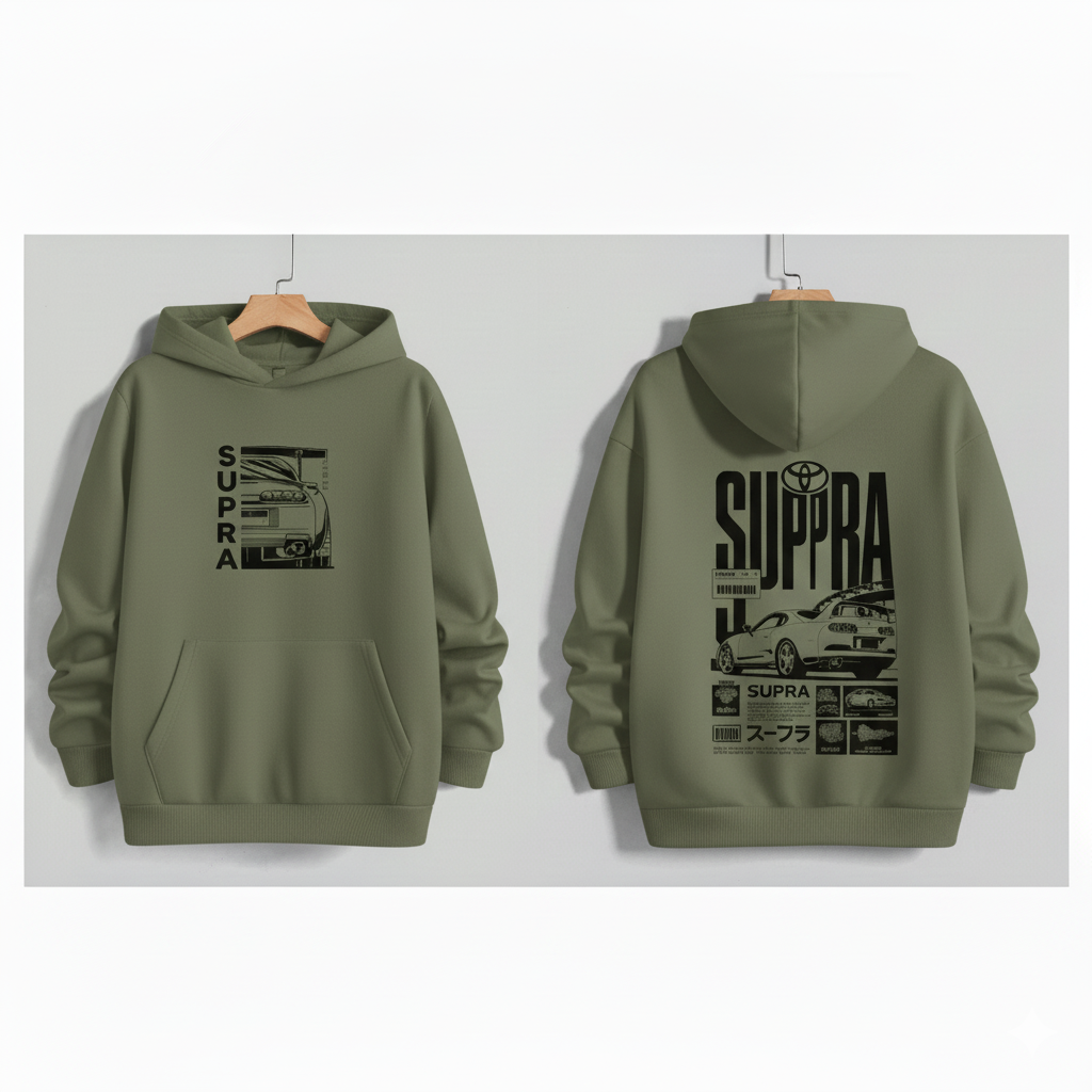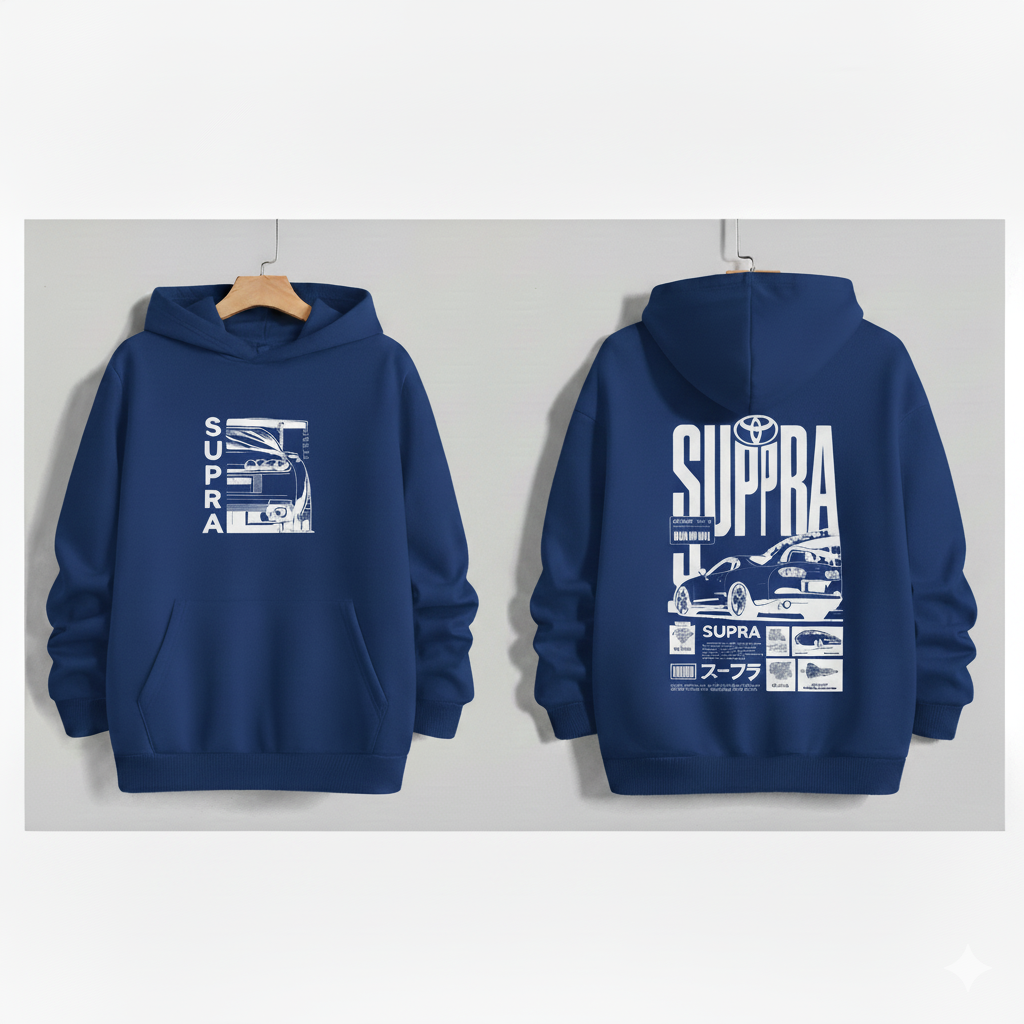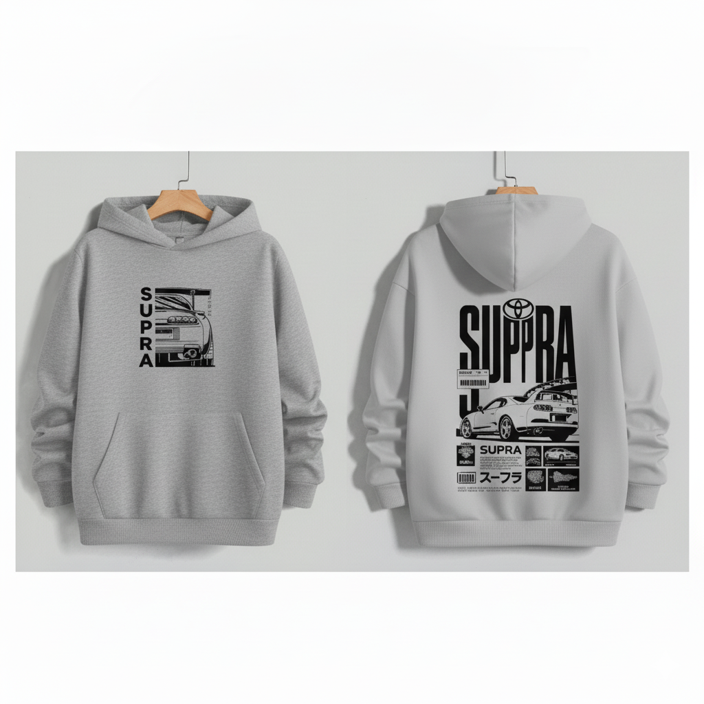 This is a bold, red pullover hoodie that celebrates the iconic Toyota Supra sports car. It features graphics on both the front and the back in high-contrast black print, appealing to car enthusiasts and fans of JDM (Japanese Domestic Market) culture.