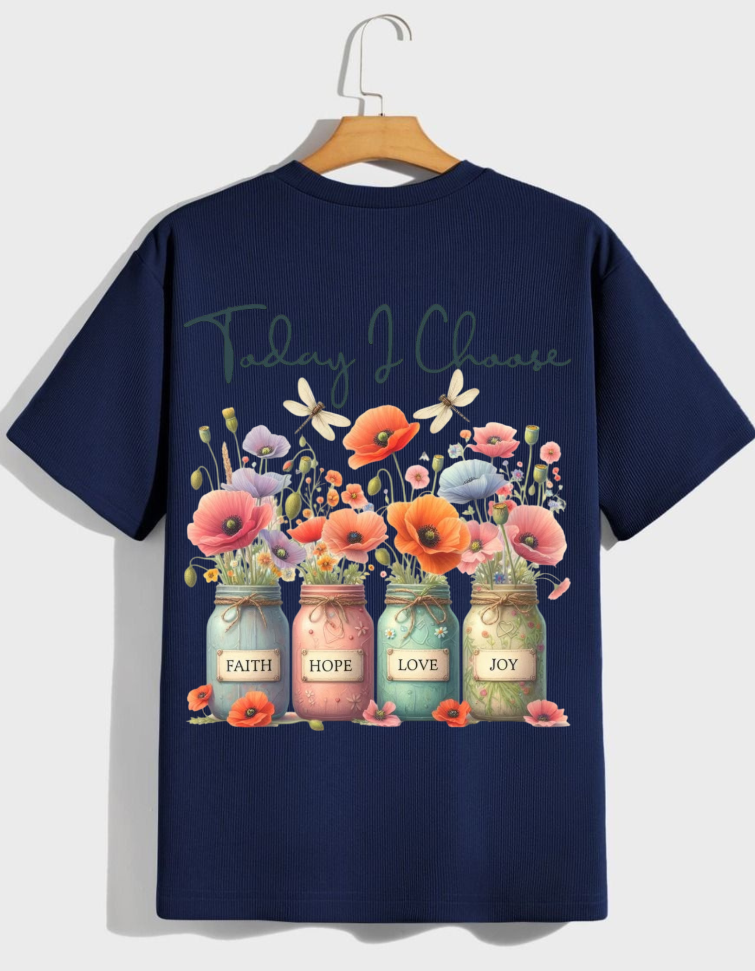 This shirt is crafted from a comfortable, ribbed fabric in a deep Navy Blue and features a modern, slightly oversized dropshoulder fit. The striking back graphic features four mason jars filled with vibrant, watercolor-style wildflowers and poppies. Each jar is labeled with a virtue: FAITH, HOPE, LOVE, and JOY. Arching above the colorful arrangement is a script message: "Today I Choose."