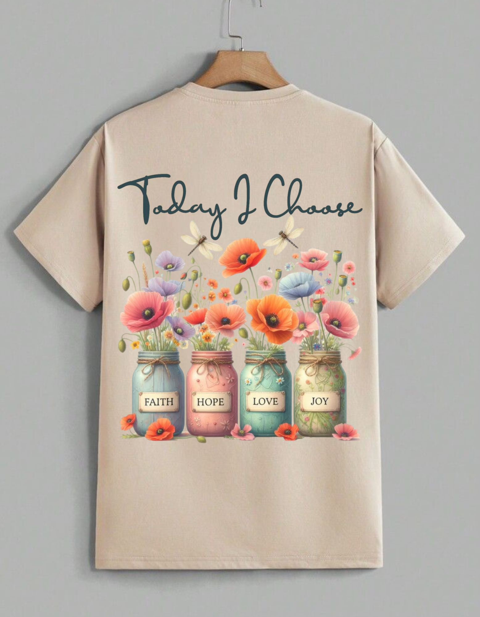 ✅ Design: Back graphic featuring Four Flower Jars labeled with FAITH, HOPE, LOVE, JOY and "Today I Choose" text
