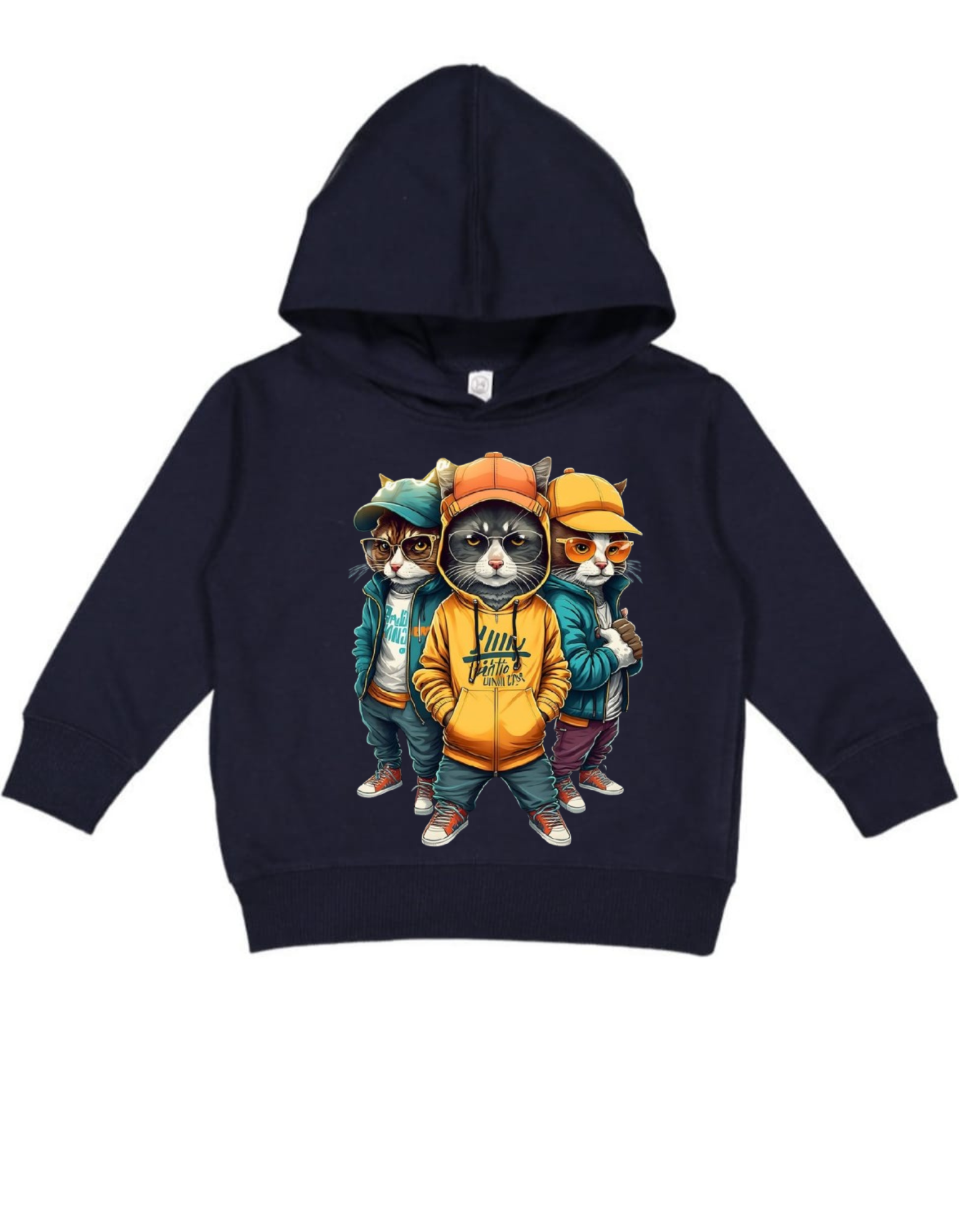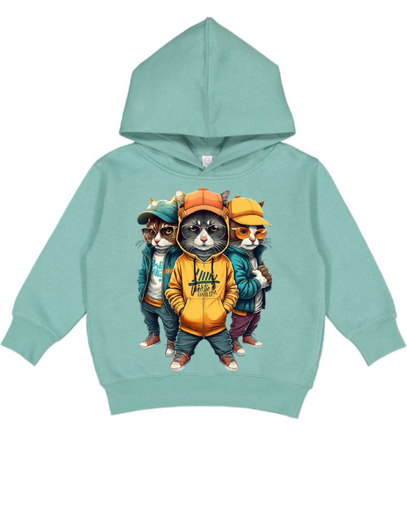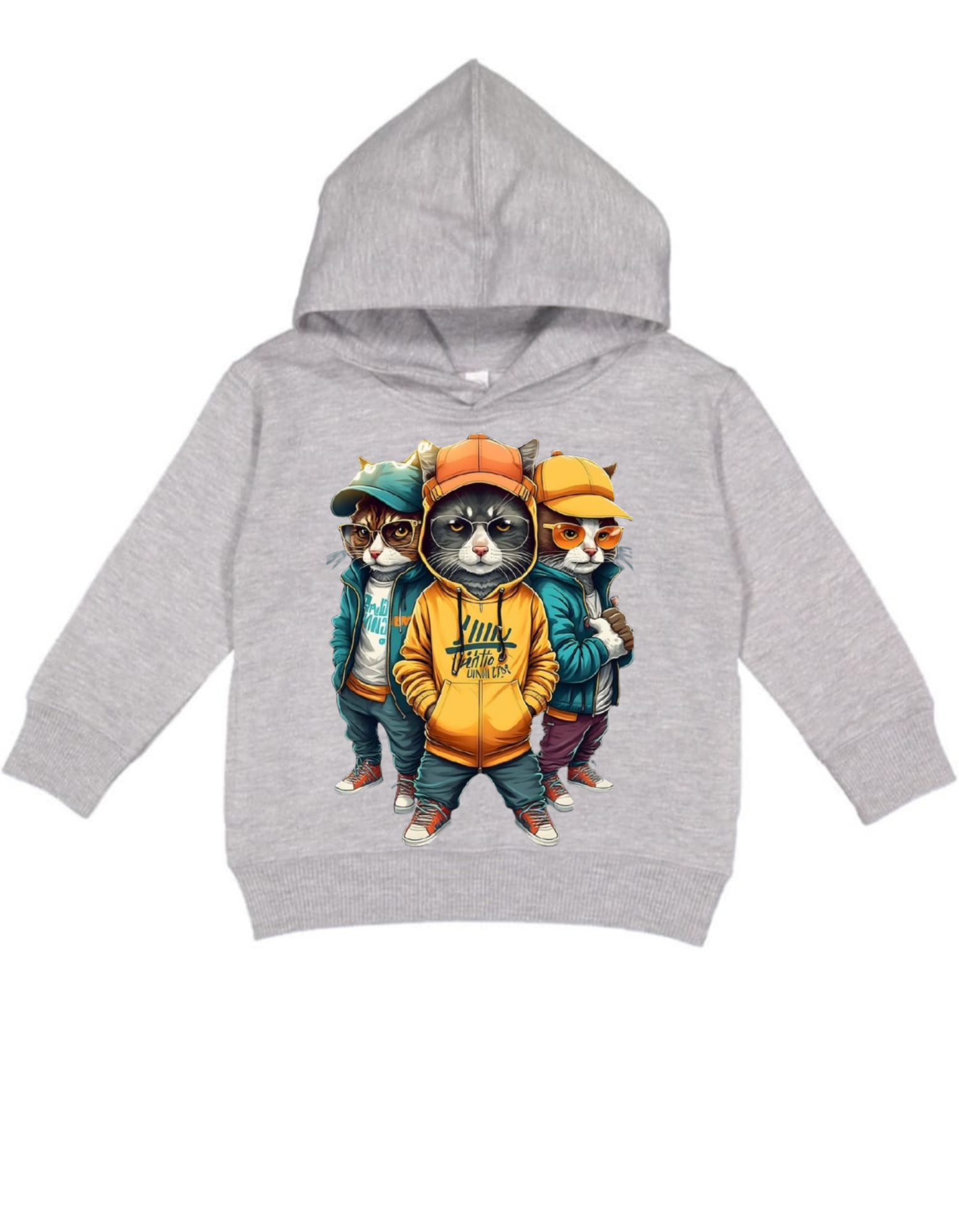 Let your little one rock the coolest look in town with this Street Style Cat Crew Hoodie! Featuring three cartoon cats dressed in trendy urban outfits, this design brings fun, attitude, and personality to every outfit.