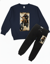 The Navy Blue sweatshirt features a striking vertical graphic of a motocross rider in action on a yellow dirt bike, set against a vintage-style parchment or map background. The coordinated Black joggers have a matching, smaller version of the graphic on the thigh, along with stylish quilted knee patches.