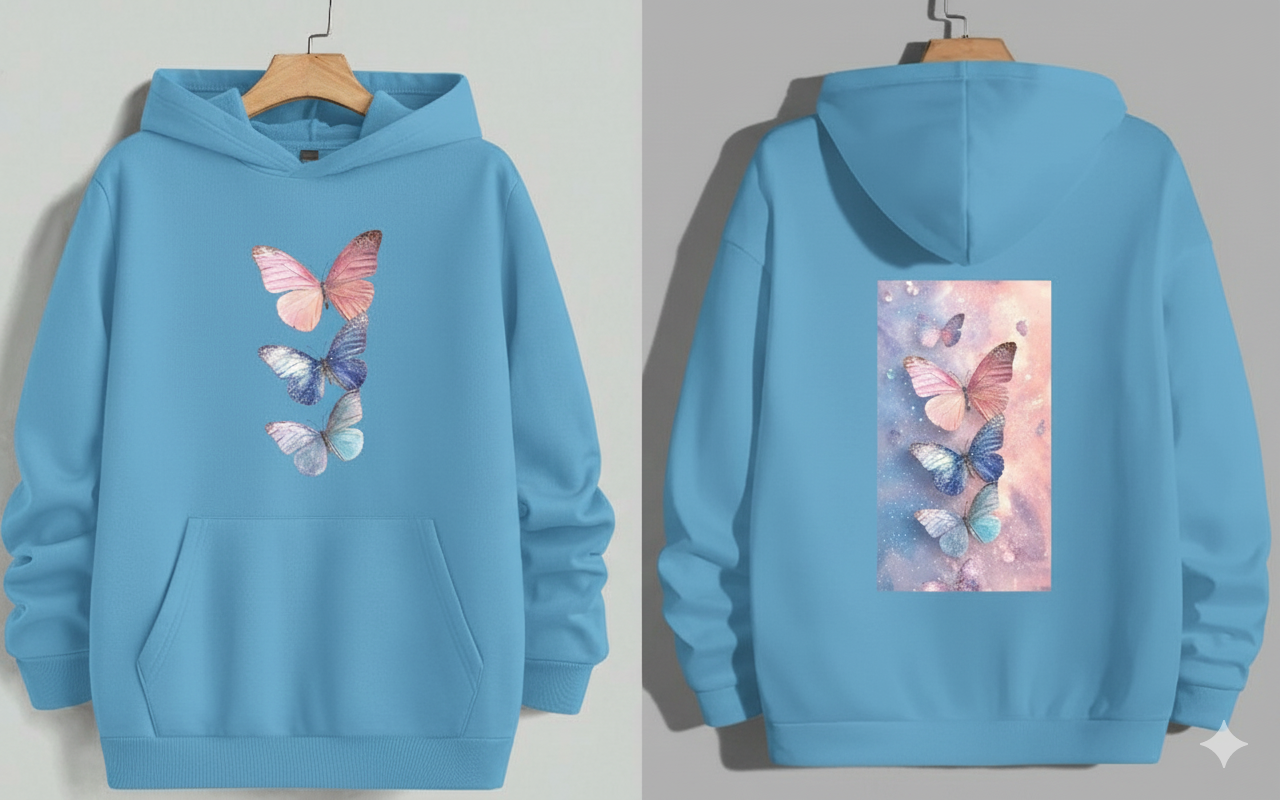 This is a pullover hoodie in a soft, bright shade of light blue or cyan. It features a cohesive design of watercolor butterflies across both the front and the back.