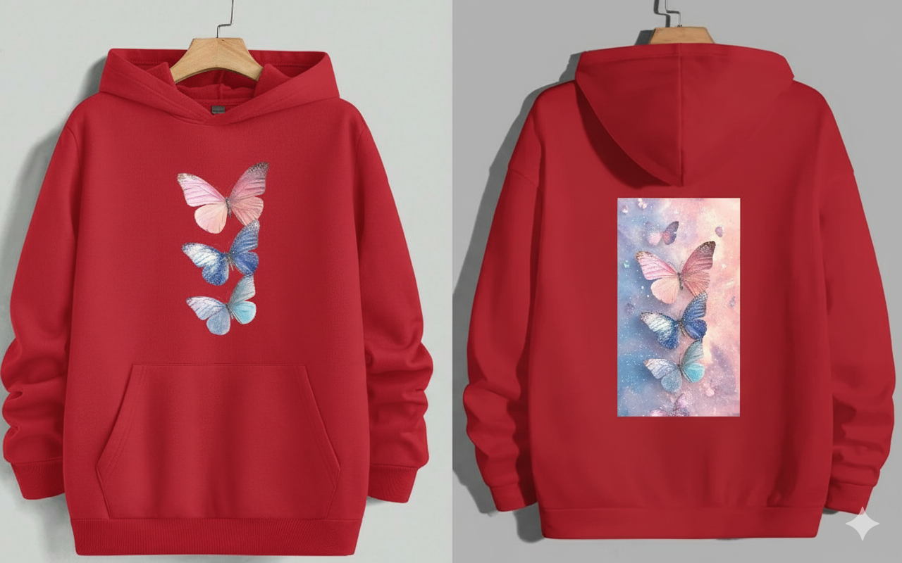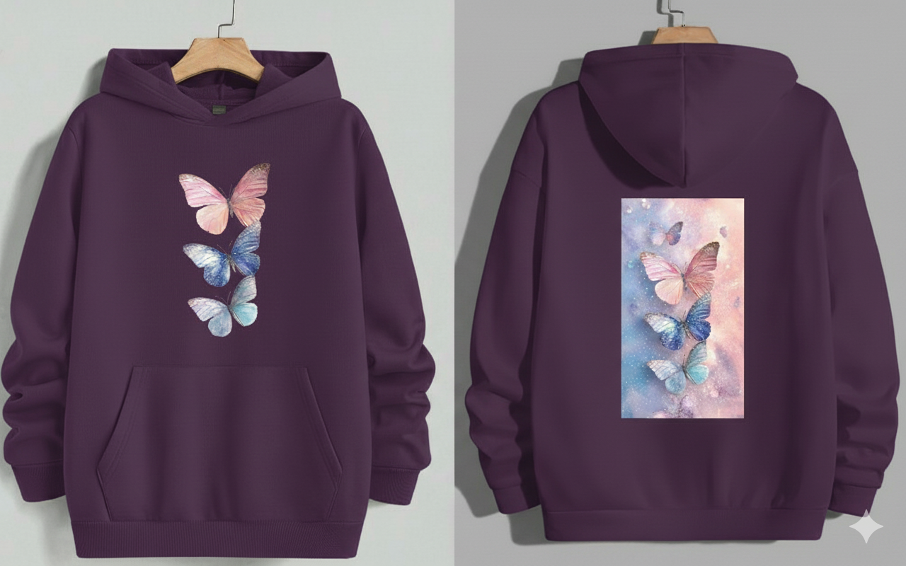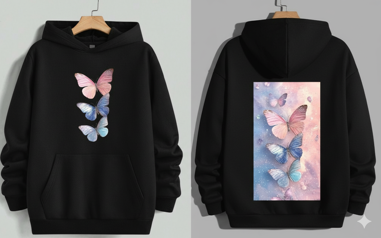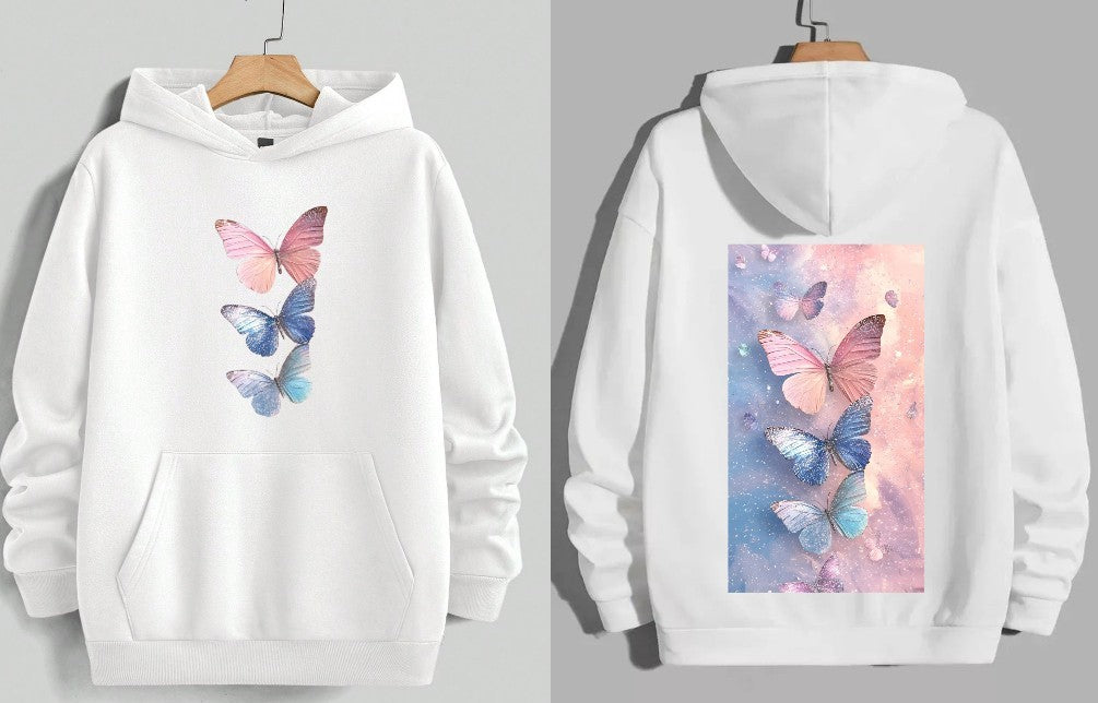 Back Graphic: A larger, rectangular print centered on the back repeats the image of the three main butterflies. They are set against a soft, blended watercolor background featuring pinks, purples, and blues, giving the appearance of a dreamy sky or mystical landscape.