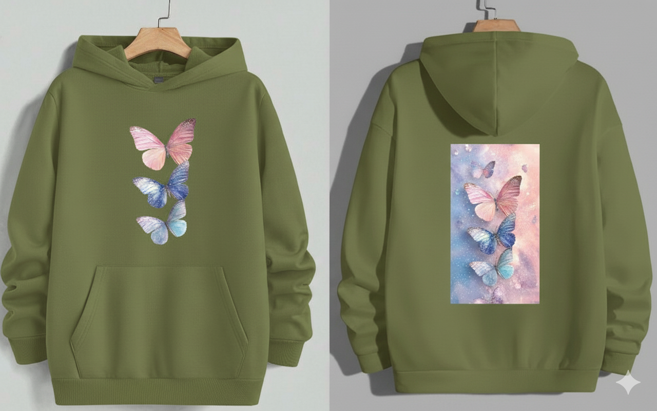 Front Graphic: A vertical column of three watercolor-style butterflies is centered on the chest. The butterflies are painted in soft, blended hues: