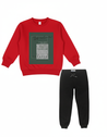 The Light Pink sweatshirt features a beautiful graphic of a large red flower where the petals on one side are transforming into a cascade of small red hearts. The coordinated Black joggers offer a sleek, solid look with subtle quilted knee patches.
