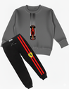 The Heather Gray sweatshirt features a striking overhead graphic of a red Ferrari Formula 1 car with bold black racing stripes running down the center. The coordinated Black joggers feature contrasting red racing stripes down the side and are finished with an embroidered Ferrari shield/crest badge and stylish quilted knee patches.