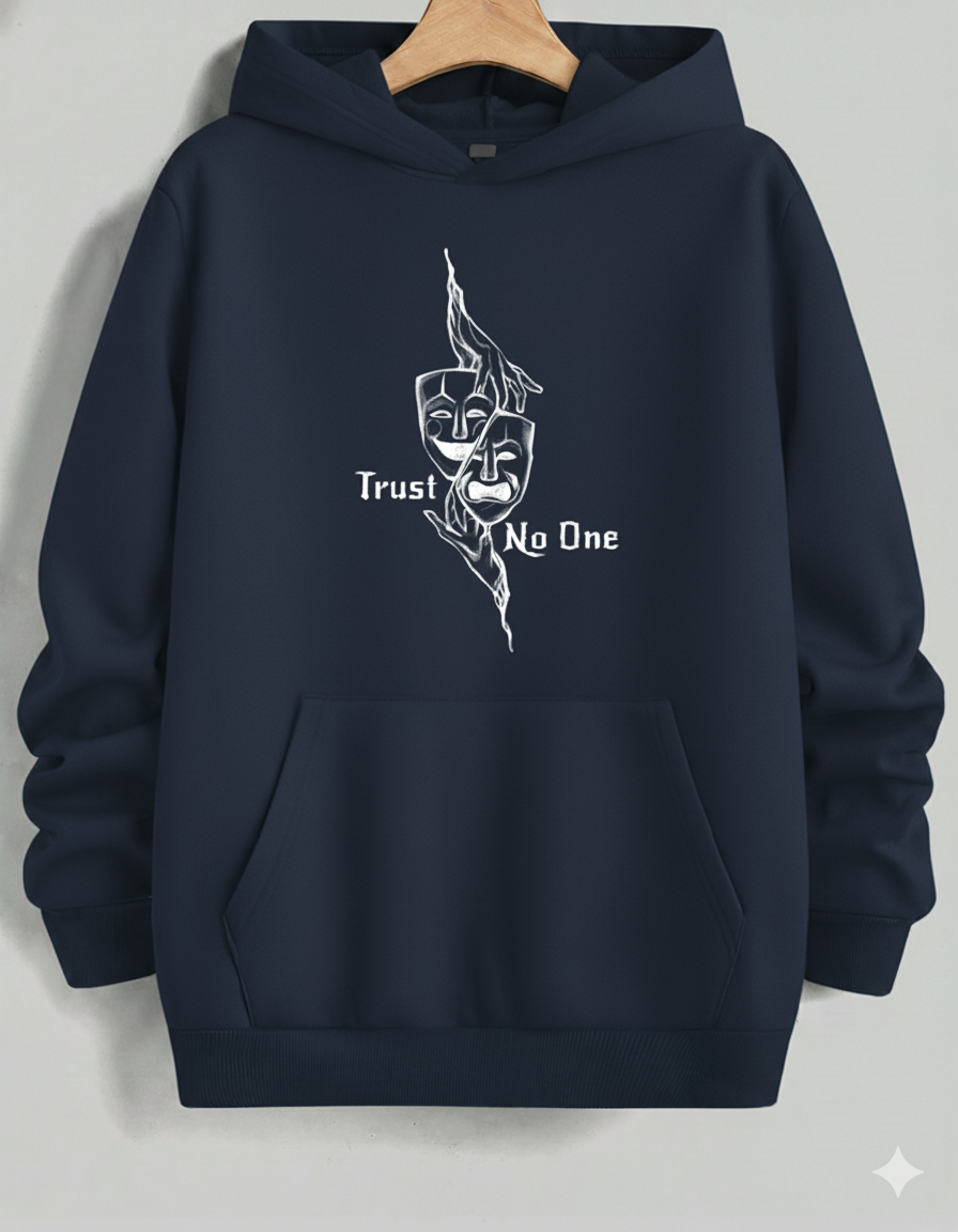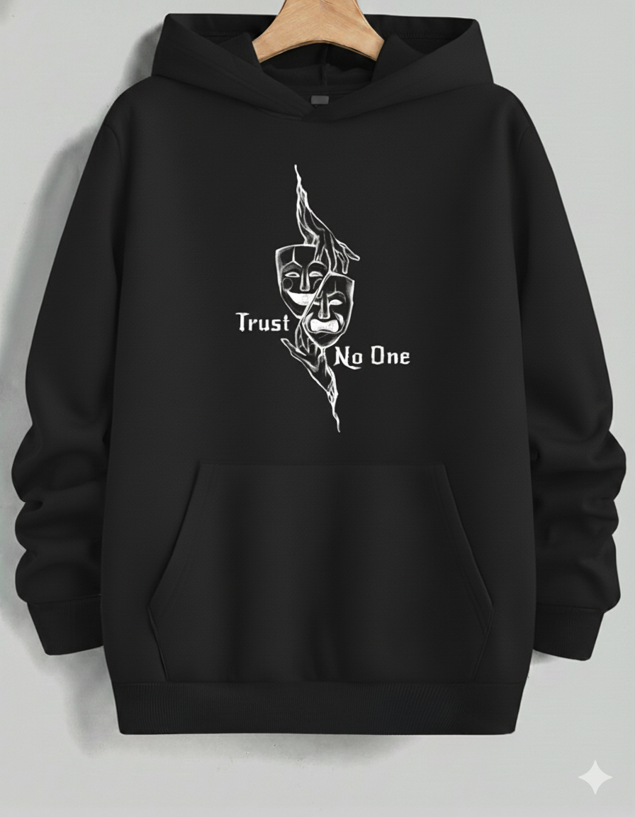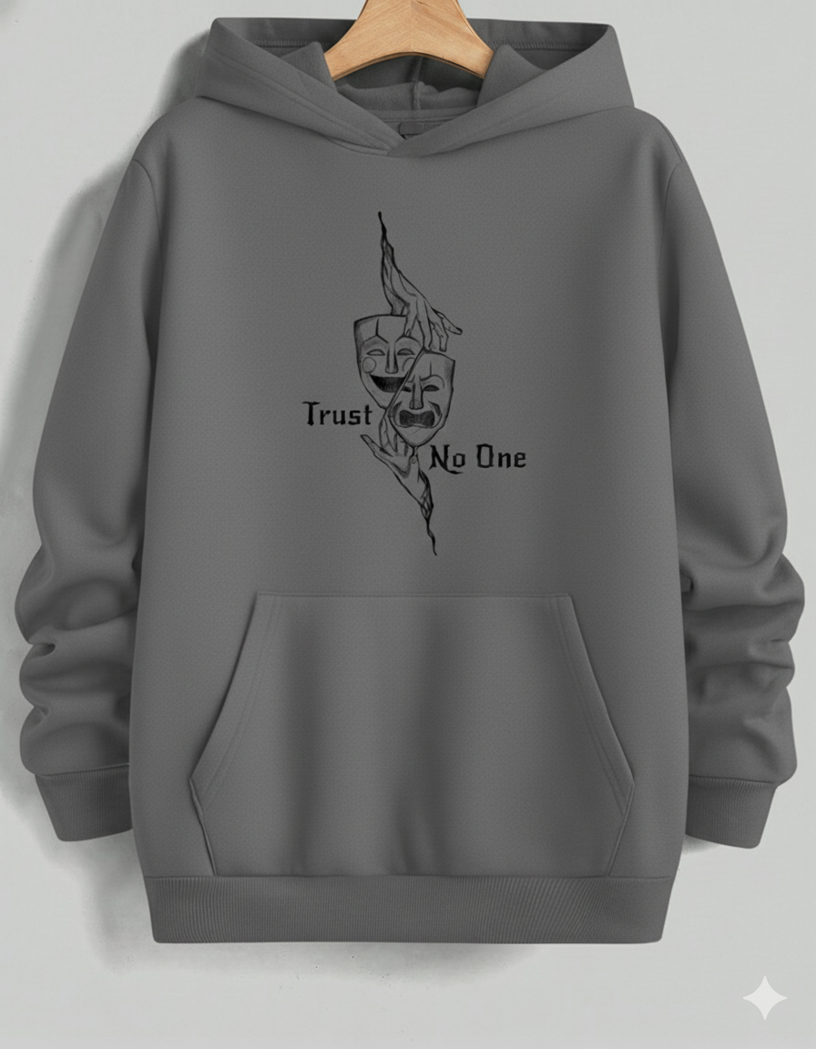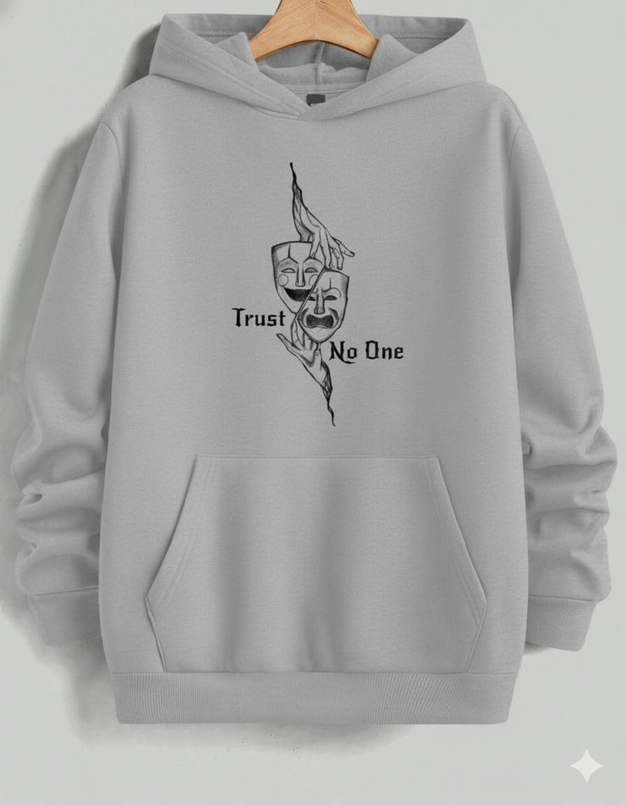 Stay cozy and contemplative in this comfortable light-to-medium grey hoodie. It features a striking, stylized black graphic of Comedy and Tragedy theater masks grasped by hands, creating a haunting visual. The text "Trust No One" is split across the design, adding an element of mystery and skepticism. Ideal for casual wear, this hoodie offers a relaxed fit and a soft interior, making it your go-to layer for cool weather while showcasing an introspective and dramatic aesthetic.