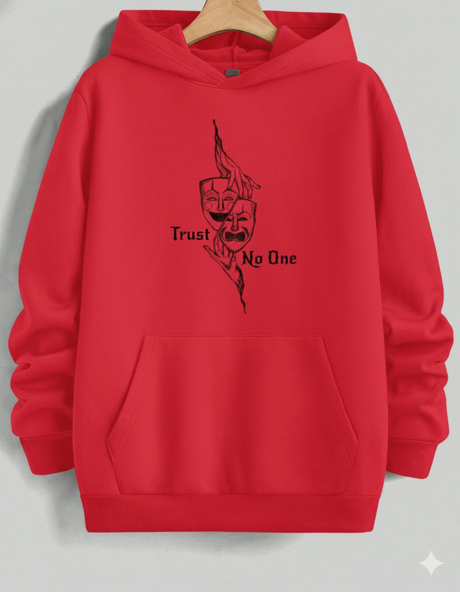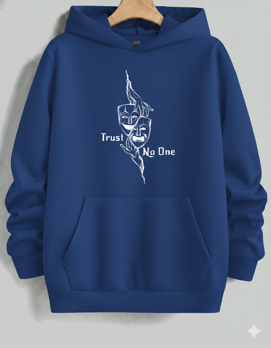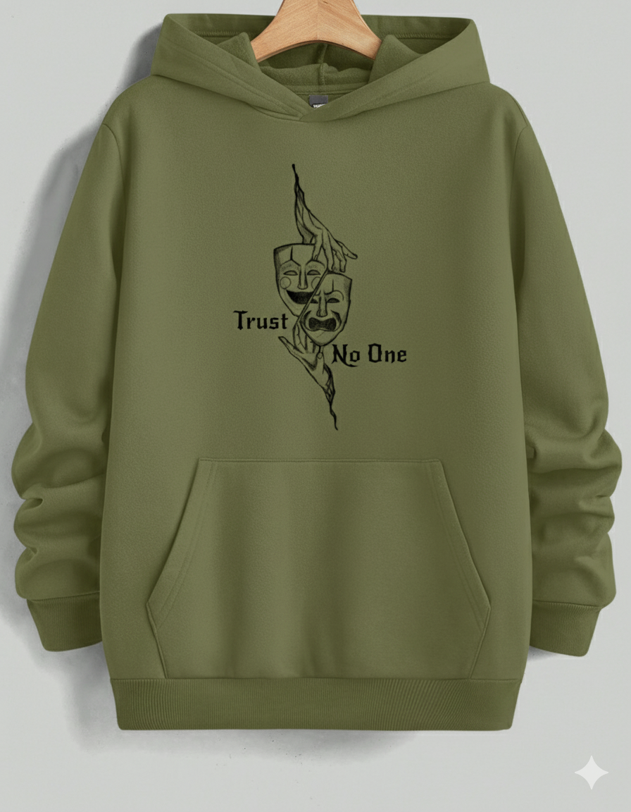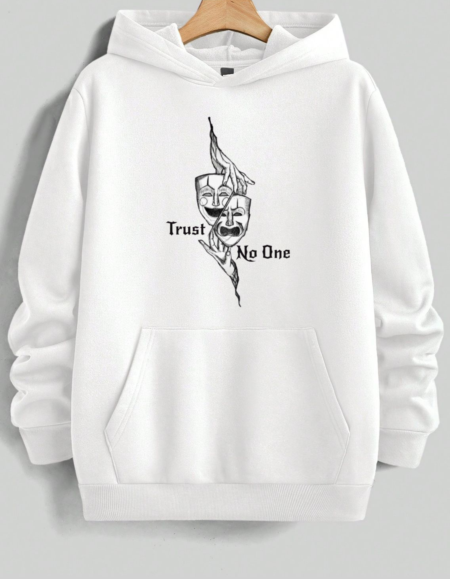 Stay cozy and contemplative in this comfortable light-to-medium grey hoodie. It features a striking, stylized black graphic of Comedy and Tragedy theater masks grasped by hands, creating a haunting visual. The text "Trust No One" is split across the design, adding an element of mystery and skepticism. Ideal for casual wear, this hoodie offers a relaxed fit and a soft interior, making it your go-to layer for cool weather while showcasing an introspective and dramatic aesthetic.