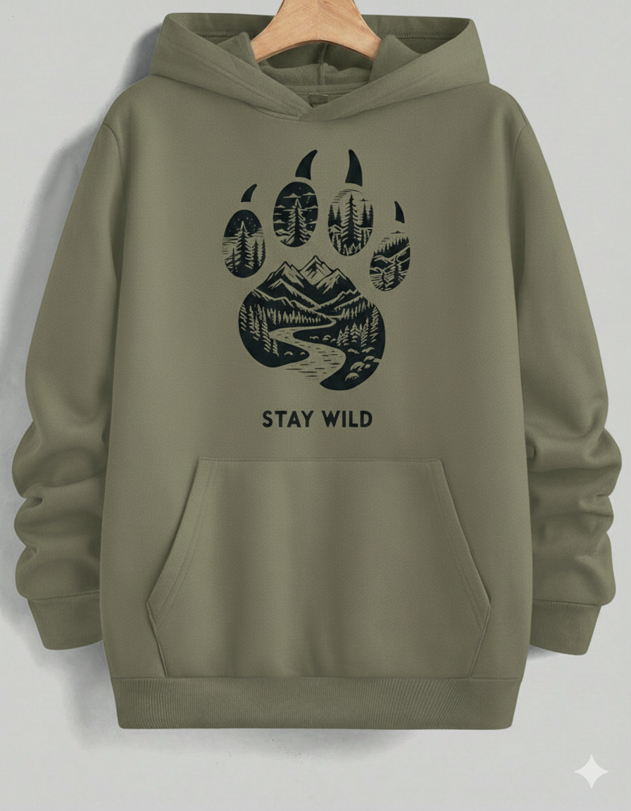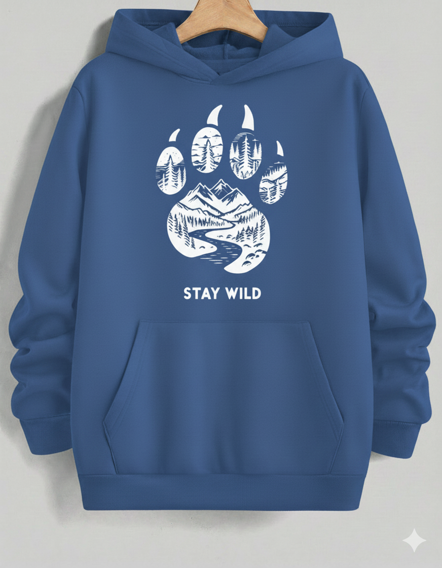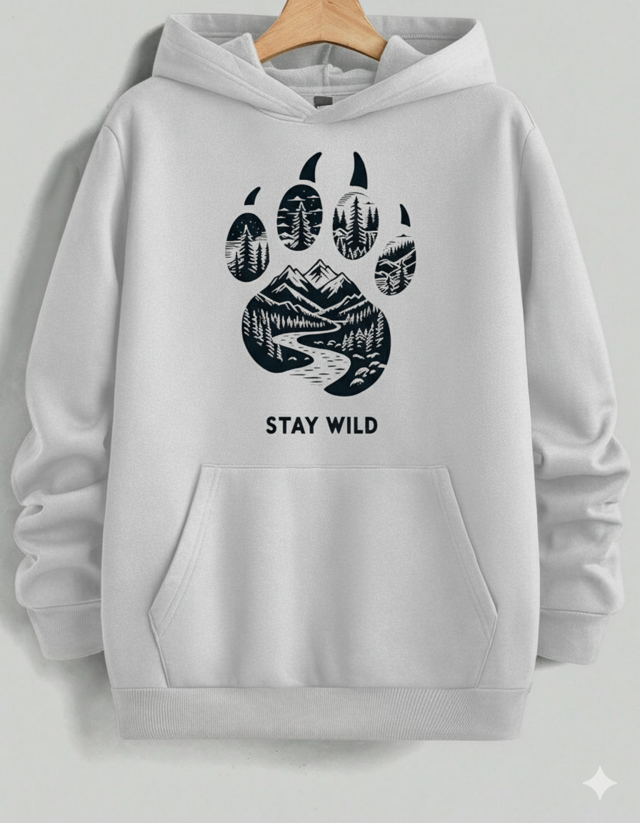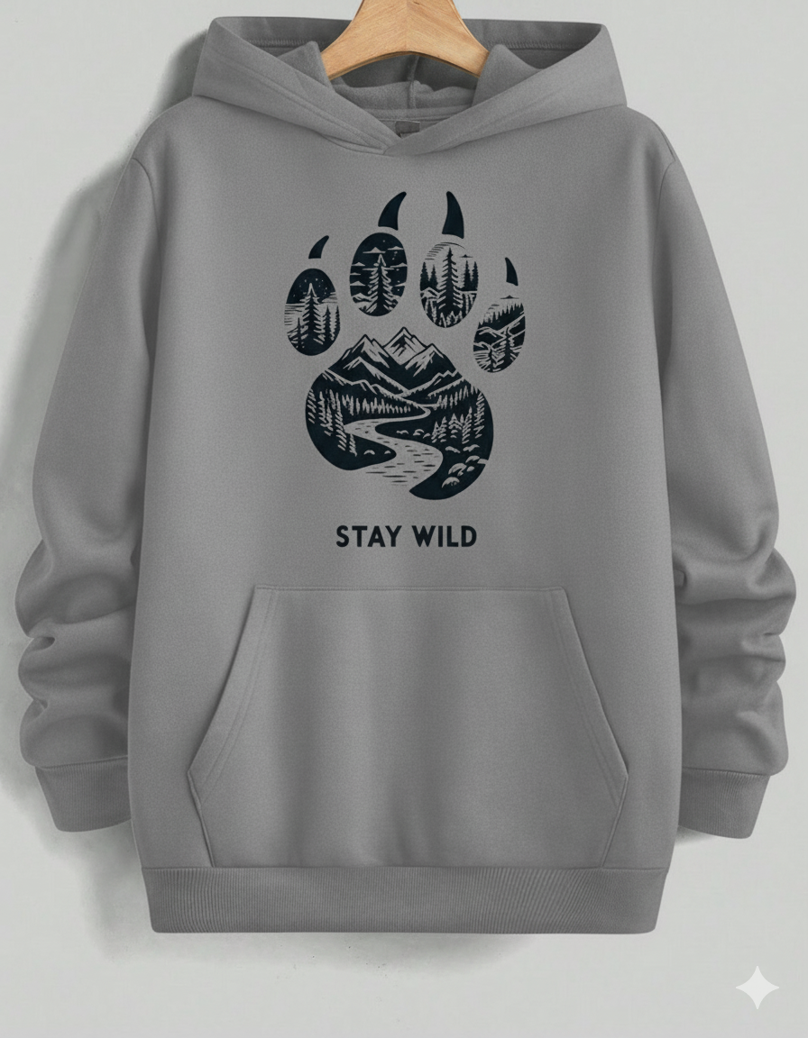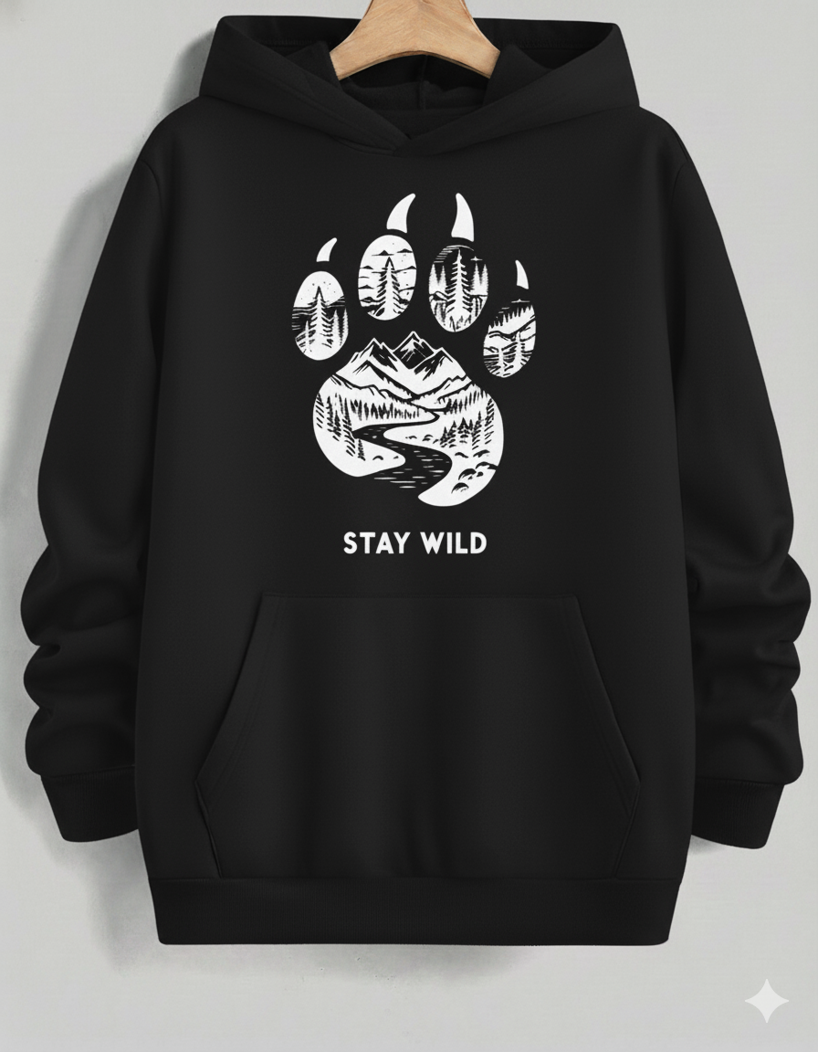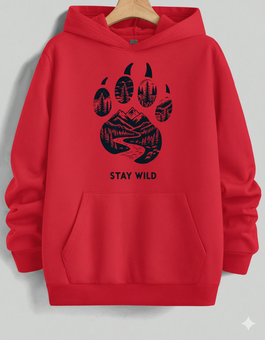 Ignite your adventurous spirit with this eye-catching, vibrant red pullover hoodie. It features a bold, large black graphic centered on a powerful bear paw print, which holds a beautifully detailed wilderness scene—towering mountains, a winding river, and a dense pine forest. The motto "STAY WILD" beneath the print serves as a call to nature. Made from a soft, cozy material, this hoodie is perfect for hikers, campers, and anyone who loves the great outdoors.