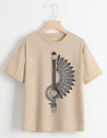This shirt features a soft, breathable fabric in a neutral Tan/Khaki color with a modern, slightly oversized dropshoulder fit. The central graphic showcases a detailed, stylized image of a banjo/mandolin-style guitar positioned vertically. Adorning the right side of the guitar is a large, intricate wing design featuring a complex black and white tribal/mandala-inspired feather pattern, creating a cool, bohemian, and musical statement piece.