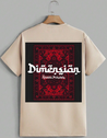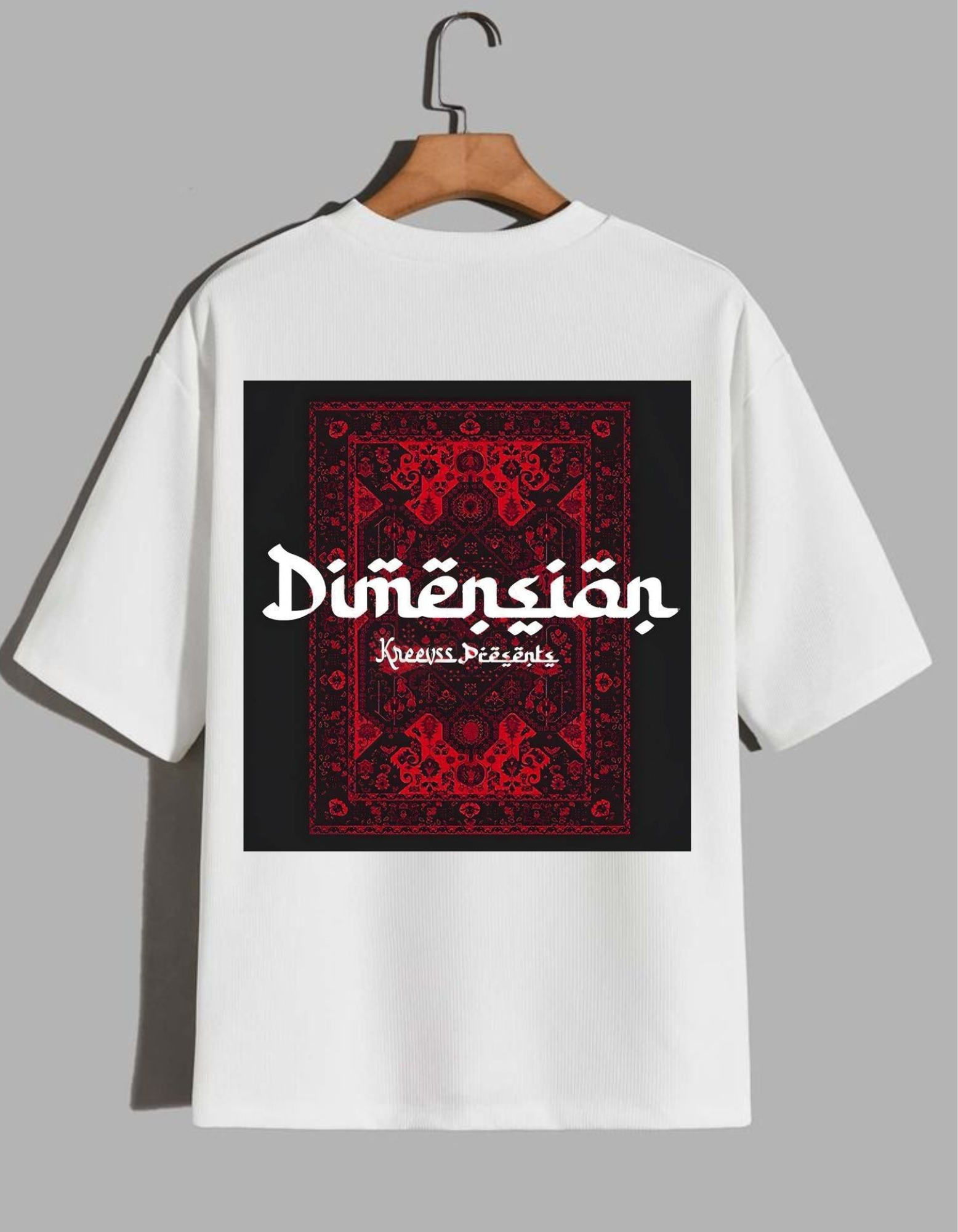 This shirt features a clean White ribbed fabric and a modern, slightly oversized dropshoulder fit. The bold back graphic is a black square containing a striking red and black intricate, Persian-style rug pattern. The word "Dimension" in a stylized white script font is layered across the design, with smaller text, "Kneevss Presents," underneath, giving the shirt a unique, culturally rich, and edgy aesthetic.